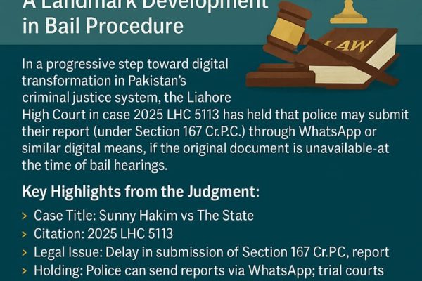 Lahore High Court allows police to submit investigation reports via WhatsApp before bail hearings — a breakthrough for timely justice and fair trial safeguards. A Landmark Development in Bail Procedure in a progressive step toward digital transformation in Pakistan’s criminal justice system, the Lahore High Court in case 2025 LHC 5113 has held that police…